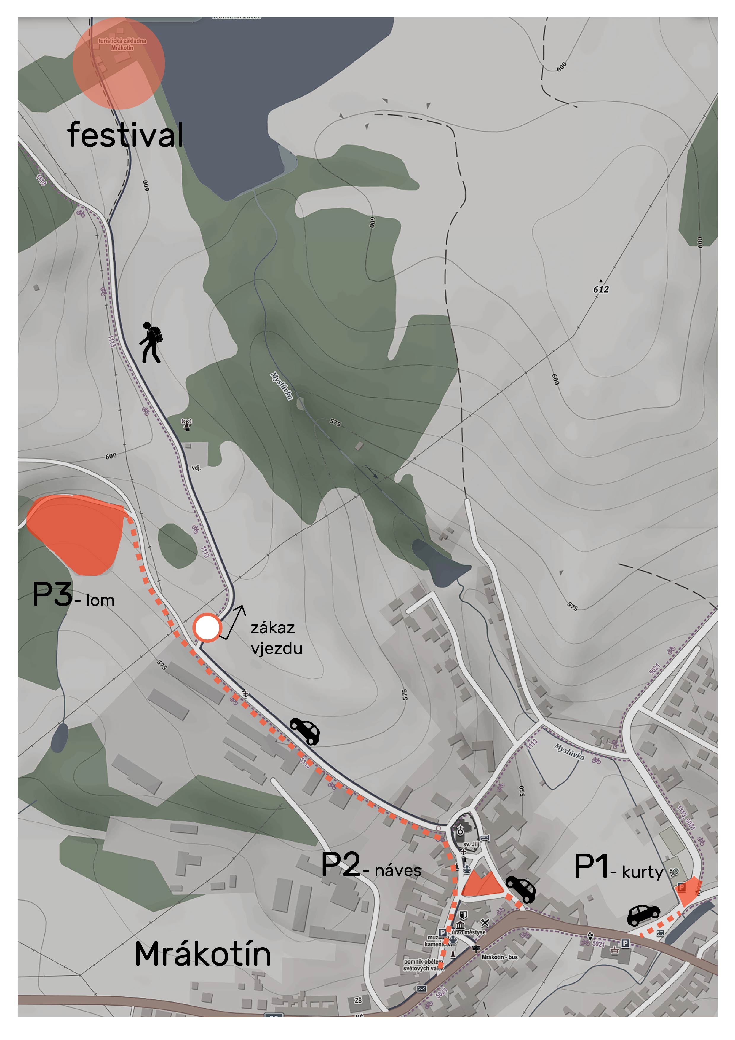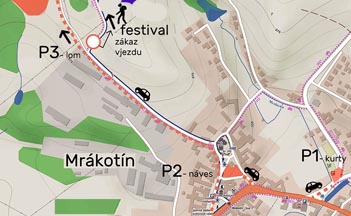 PARKOVÁNÍ – Prosíme všechny, kteří přijedou autem, aby je nechali zdarma na vyznačených místech v obci Mrákotín, 1 kilometr od místa festivalu – viz plánek ZDE. Vjezd na místo festivalu s výjimkou kol a účinkujících nebude povolen.